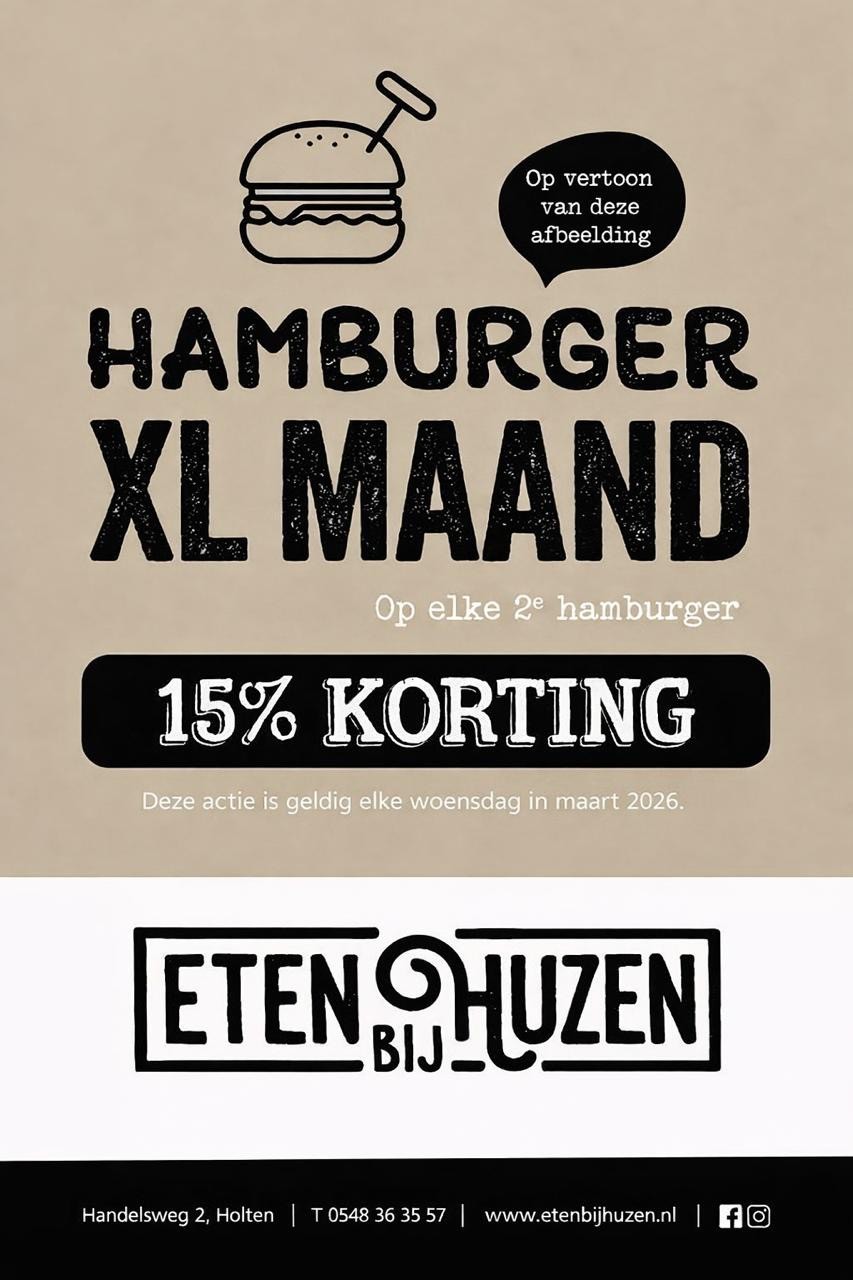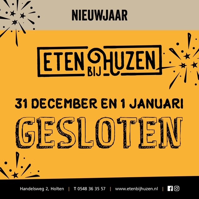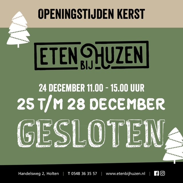 Op het industrieterrein van Holten is Eten bij Huzen gevestigd. Een eigentijdse en knusse eetlocatie, makkelijk bereikbaar en met eigen parkeerplaatsen voor de deur. Eet bij ons een vers belegd broodje, een heerlijk huisgemaakt lunchgerecht of één van onze speciale burgers. Voor bedrijven verzorgen en bezorgen we complete lunches of warme maaltijden voor vergaderingen.